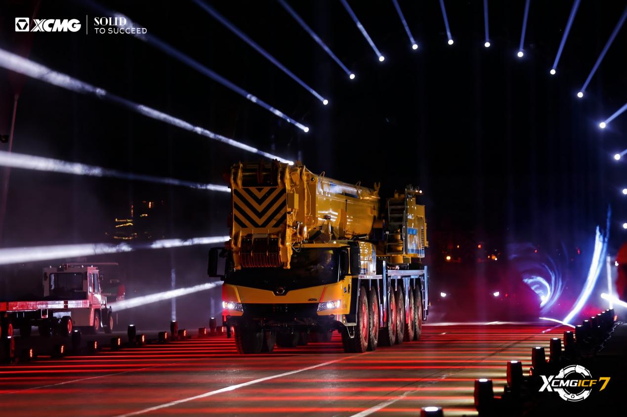 引擎轟鳴,16臺(tái)起重機(jī)列陣如虹,XCA900L8_1全地面起重機(jī)領(lǐng)銜,輪式與履帶產(chǎn)品組成“鋼鐵艦隊(duì)”。車隊(duì)駛過(guò)觀禮臺(tái),客商們紛紛舉起手機(jī)定格畫面,客商高呼:“Amazing!”鳴笛聲中,設(shè)備駛向全球,燈光在夜幕中匯成“時(shí)光隧道,照亮遠(yuǎn)征之路。