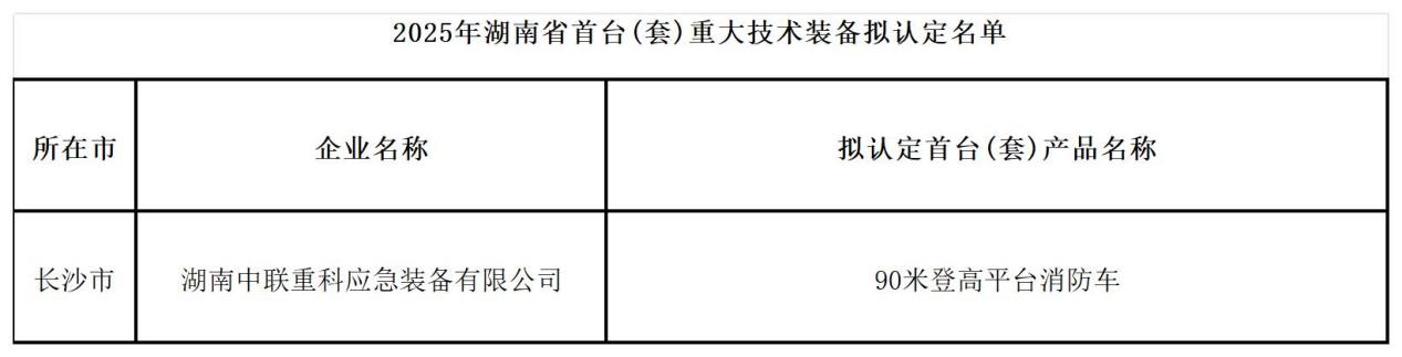 中聯重科90米登高平臺消防車入選《2025湖南省首臺(套)重大技術裝備擬認定名單》