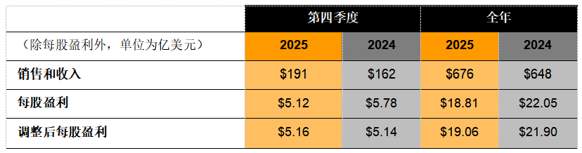 2025年第四季度銷售和收入為191億美元,較2024年第四季度的162億美元增長18%。2025年第四季度營業利潤率為13.9%,而2024年第四季度為18.0%。2025年第四季度調整后營業利潤率為15.6%,而2024年第四季度為18.3%。2025年第四季度每股盈利為5.12美元,而2024年第四季度每股盈利為5.78美元。2025年第四季度調整后每股盈利為5.16美元,而2024年第四季度調整后每股盈利為5.14美元。